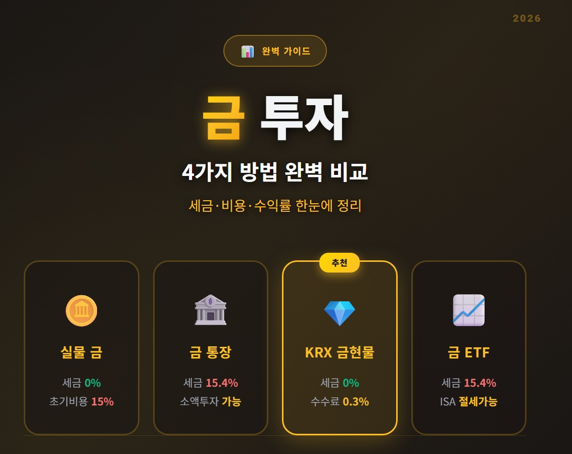 문제는 "어떻게 투자하느냐"입니다. 금 투자 방법은 4가지인데, 각각 세금과 비용이 완전히 다릅니다.